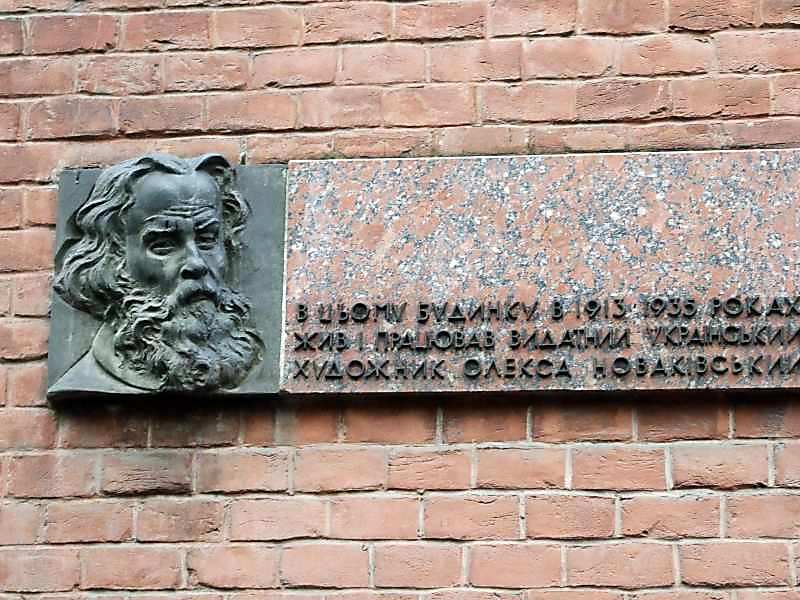 На дошці напис: «В цьому будинку в 1913 – 1935 роках жив і працював видатний український художник Олекса Новаківський».