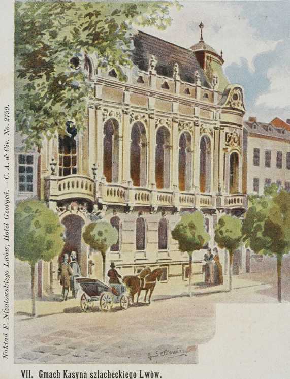 1906 р. Загальний вигоялРозмір зображення: 571:746 піксел Поштівка: будинок шляхетського казіно [= клубу] у Львові. Lwów, gmach kasyna szlacheckiego. – Lwów : nakład F. Nizatowskiego […], [ante 1906] (pocztówka); 14,1 × 8,9 cm |