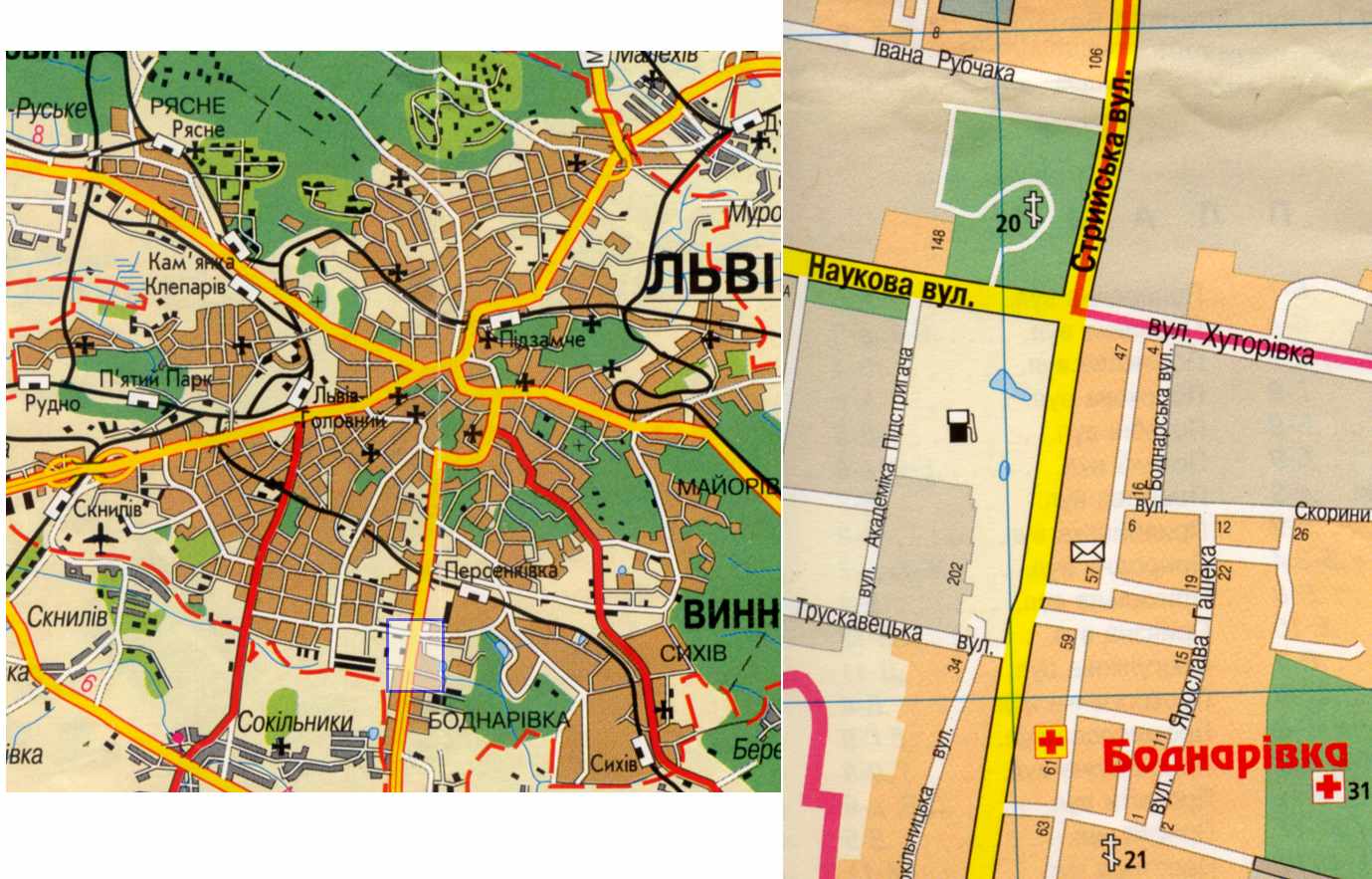 Ситуаційний план (церква позначена білим хрестом – 21)Розмір зображення: 1379:883 піксел Джерело: Карта м.Львова. – К.: 2001 р., 1:20 000. |