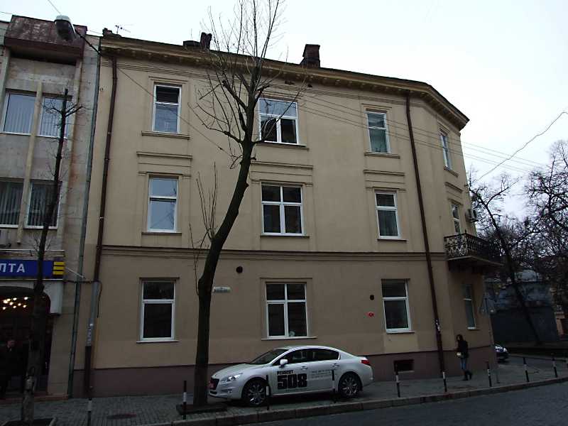 Житловий будинок (№ 3)Розмір зображення: 800:600 піксел Фасад по вул. Чайковського. Площа Маланюка – праворуч. 7 квітня 2012 р. Фото М.І.Жарких. |