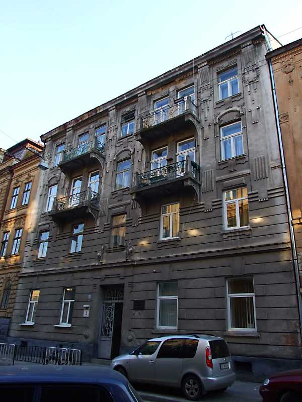 2013 р. Загальний вигляд Розмір зображення: 600:800 піксел 16 квітня 2013 р. Фото М.І.Жарких. Вкладені елементи Сецесійне вікно 4-го поверху Сецесійне вікно 3-го поверху