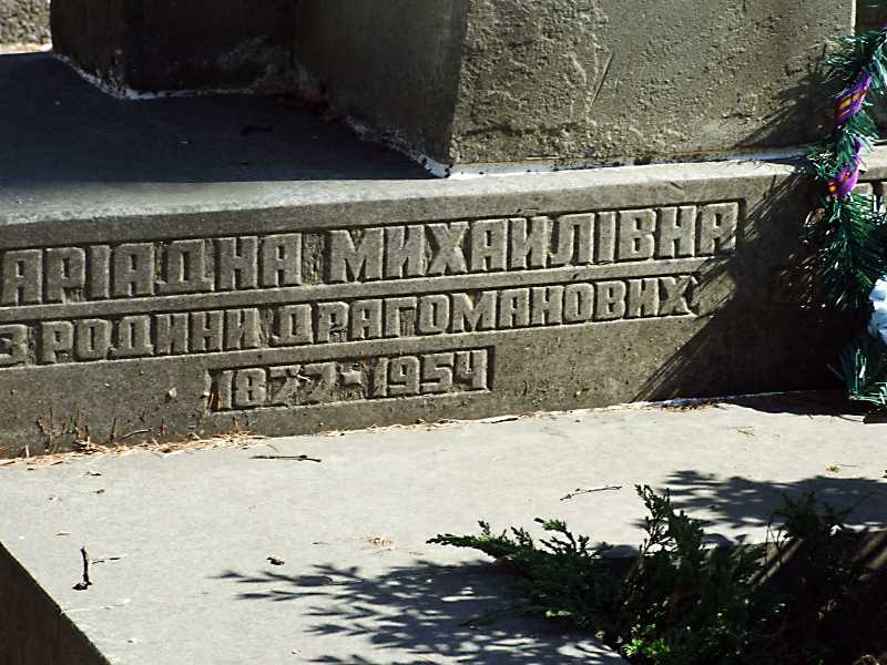 Напис на надгробкуРозмір зображення: 800:600 піксел 19 квітня 2013 р. Фото М.І.Жарких. «Аріадна Михайлівна з Драгоманович (1877 – 1954)» |