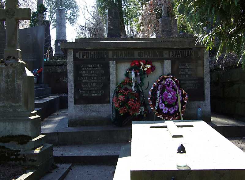 Гробниця родини Франків – Галущаків Розмір зображення: 800:588 піксел 19 квітня 2013 р. Фото М.І.Жарких. Вкладені елементи Ліва плита з іменами Права плита з іменами