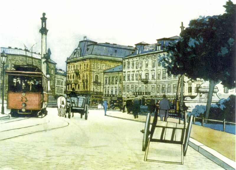 Одо Добровольський. Площа Марійська (Міцкевича) у Львові. 1907, акварель. Львівська галерея мистецтв.