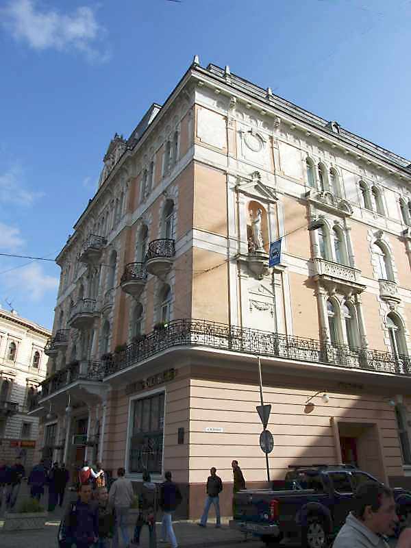 2008 р. Головний фасад у ракурсіРозмір зображення: 600:800 піксел 13 вересня 2008 р. Фото М.І.Жарких. Ліворуч – пл. Міцкевича, праворуч – вул. М. Вороного |