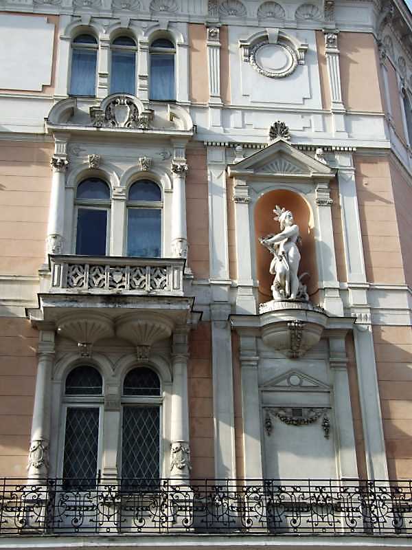 2008 р. Фрагмент фасаду по просп.Шевченка Розмір зображення: 600:800 піксел 16 жовтня 2008 р. Фото М.І.Жарких. Вкладені елементи Вікна 4-го поверху Вікна 3-го поверху Ніша зі скульптурою “Америка” (+) Вікна 2-го поверху