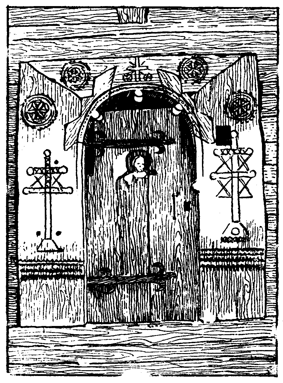 Двері ц-ви в Кривці пов. ТуркаРозмір зображення: 929:1256 піксел Джерело: Січинський В. Деревяні дзвіниці і церкви Галицької України XVI – XIX ст. – Льв.: 1925 р., № 80. |