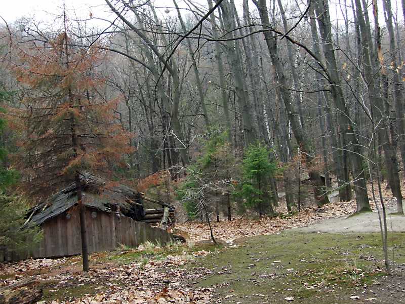 2012 р. Колиби 3 та 1Розмір зображення: 800:600 піксел 6 квітня 2012 р. Фото М.І.Жарких. Ліворуч, ближче до нас – колиба 3 (з тильного боку); праворуч, в глибині за деревами – колиба 1 (також з тильного боку). |
