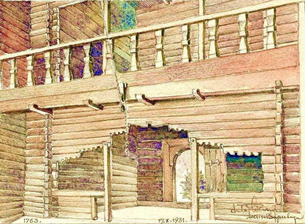 1931 р. Інтер’єр з видом на хориРозмір зображення: 1034:760 піксел Рисунок Антона Вариводи (Краків), 17.10.1931 р. 1763 Church, Kryvka (Krywka), Turka, Poland. 2 – Interior view of choir gallery. |