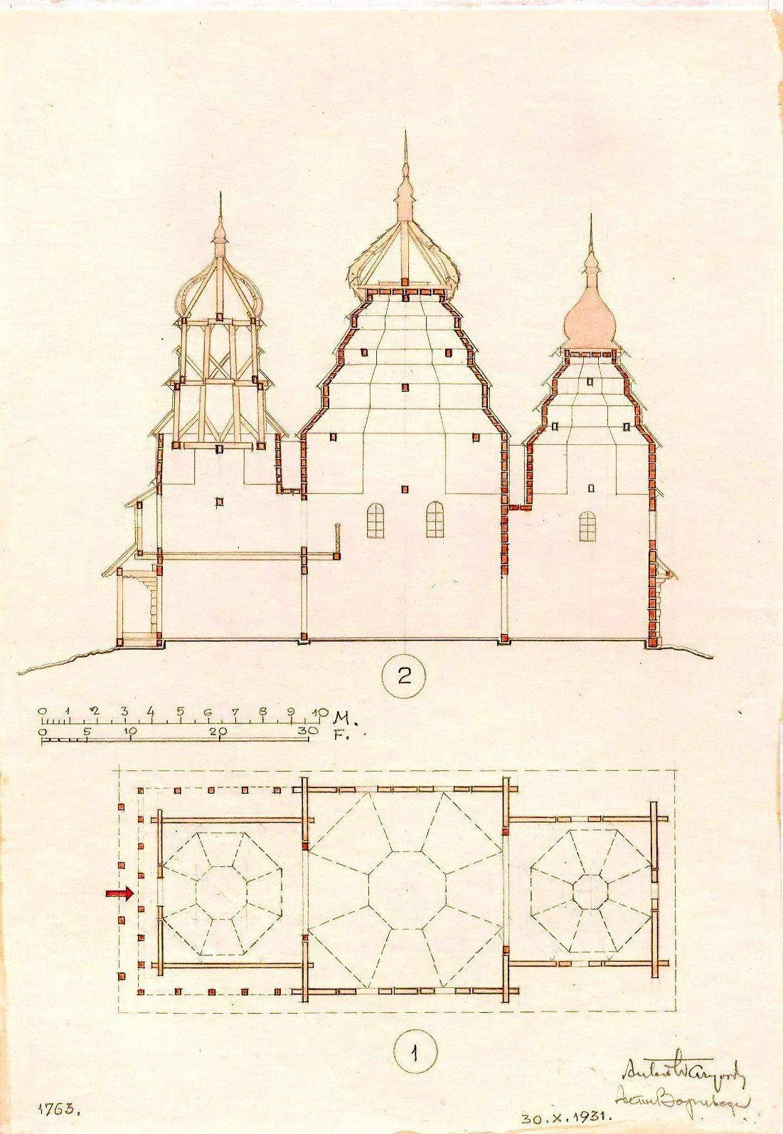 1931 р. План і перерізРозмір зображення: 1101:1593 піксел Рисунок Антона Вариводи (Краків), 30.10.1931 р. 1763 Church, Kryvka (Krywka), Turka, Poland. 1 – Ground plan; 2 – Longitudinal section. |