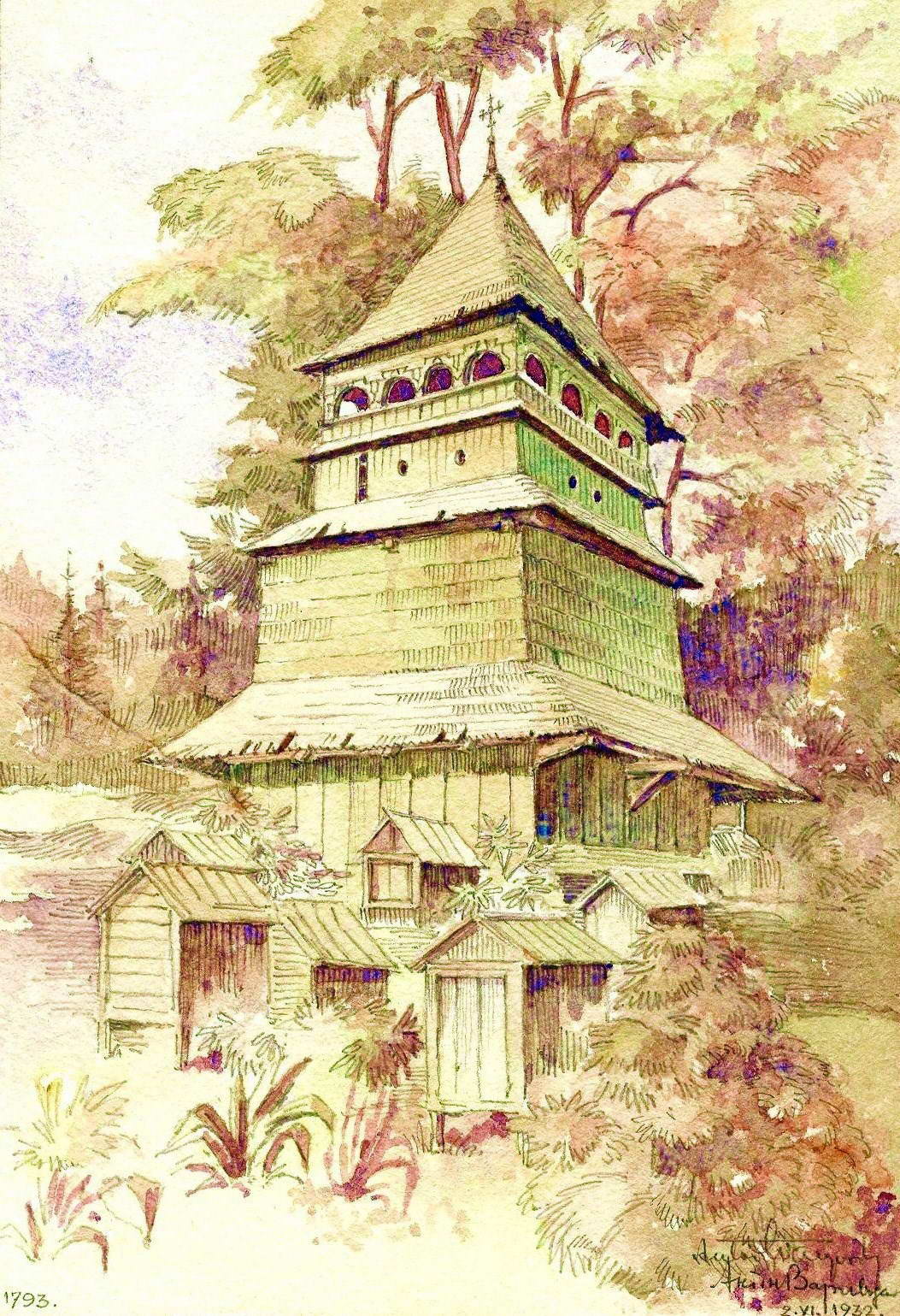1793 Church belltower, Kryvka (Krywka), Turka, Poland. Southwestern view.