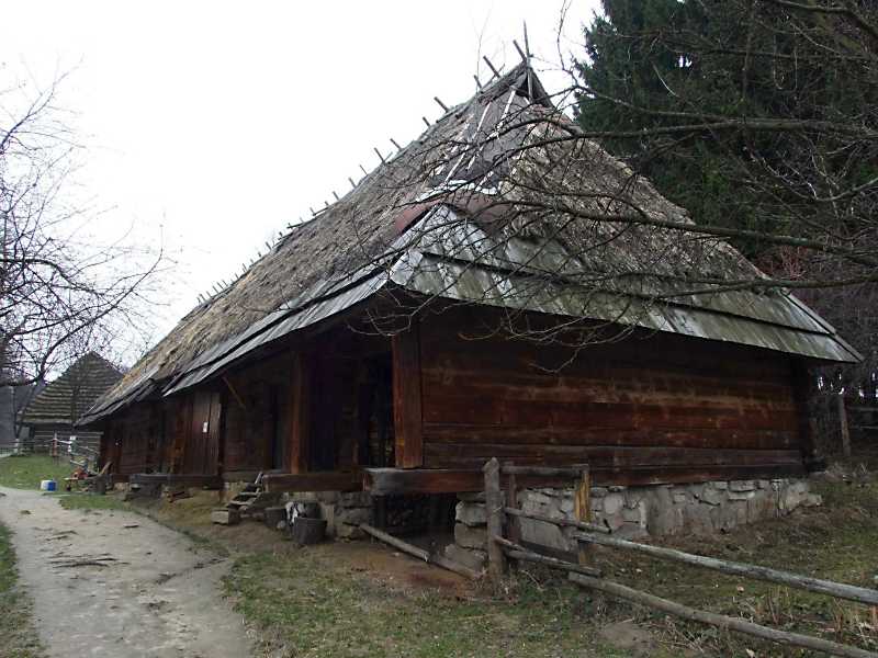 Довга хата 1909 р. із с. Шандровець Турківського району Львівської області. Встановлена в музеї в 1984 р.