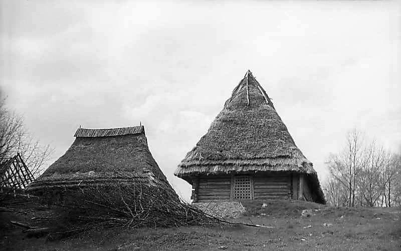 1976 р. Хата із с.Пилипець (ліворуч), стодола із с. ПилипецьРозмір зображення: 800:502 піксел 1976 р. 25 квітня. Фото М.І.Жарких. Негатека, № A118-24. |