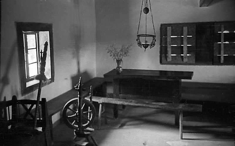 1977 р. Інтер’єр з прялкою і столомРозмір зображення: 800:497 піксел 1977 р. 24 липня. Фото М.І.Жарких. Негатека, № A345-31. |