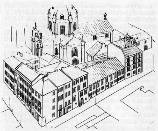Квартал біля костелу домініканцівРозмір зображення: 654:544 піксел Вигляд з південного заходу. Реконструкція Юрія Теслюка 1996 р. [Долинська М. Львів: простір на тлі мешканців. – Льв.: 2015 р., с. 141]. Нині всі будинки цього кварталу знесені. |