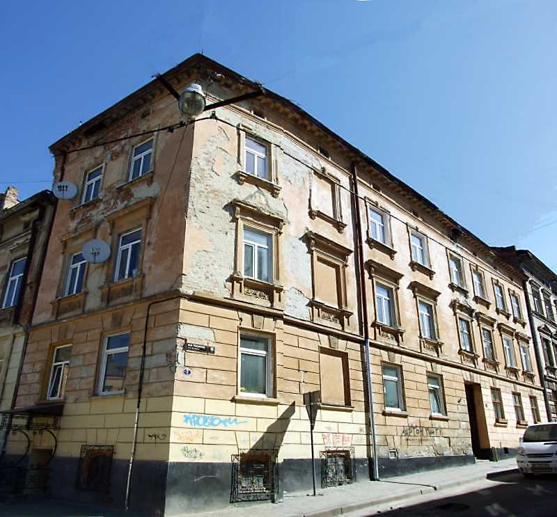 Житловий будинок (№ 1)Розмір зображення: 800:743 піксел Ліворуч – вулиця Вічева, праворуч – вулиця Насипна. 18 квітня 2013 р. Фото М.І.Жарких. |