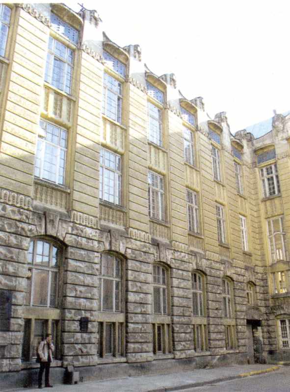 [2005 р.] Фрагмент головного фасадуРозмір зображення: 591:800 піксел Технологічний інститут. Головний фасад. 1909 р. Джерело: Бірюльов Ю. Мистецтво львівської сецесії. – Льв.: Центр Європи, 2005 р., с. 100. |