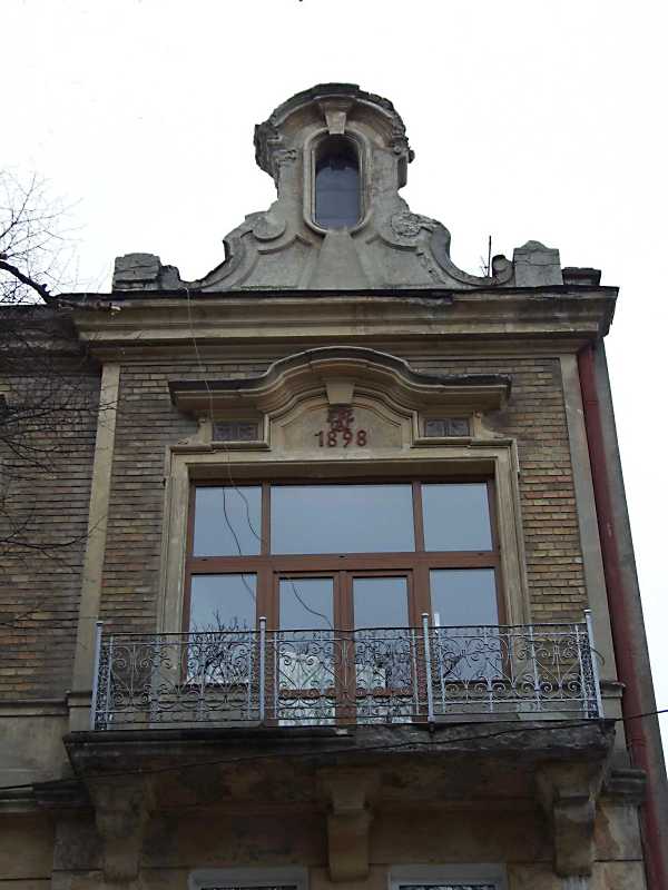 2012 р. Вікно 3-го поверху і фронтон з датою 1898Розмір зображення: 600:800 піксел 8 квітня 2012 р. Фото М.І.Жарких. |