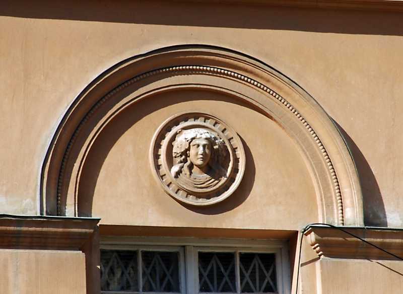 Тимпан вікна 2-го поверху з рельєфом Розмір зображення: 800:584 піксел 18 квітня 2013 р. Фото М.І.Жарких. Попередня сторінка | Вище | Наступна сторінка