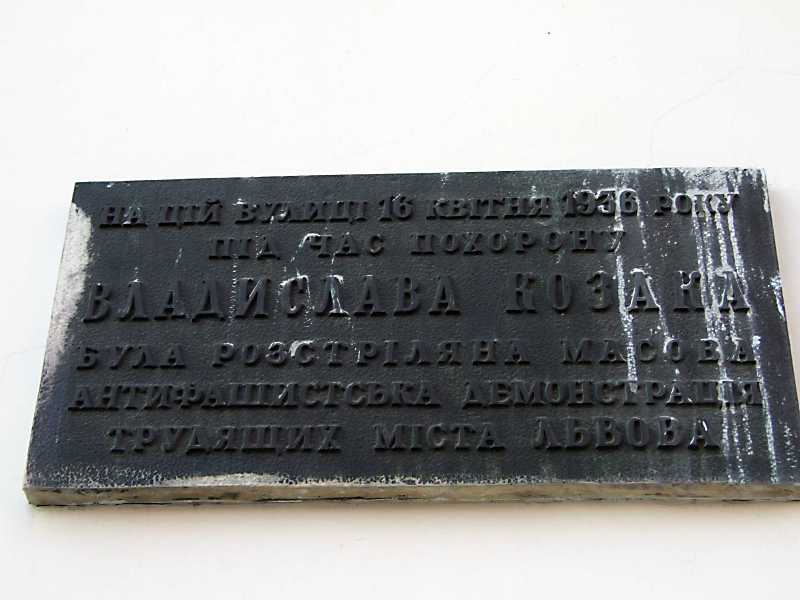 На дошці напис: «На цій вулиці 16 квітня 1936 року під час похорону Владислава Козака була розстріляна масова антифашистська демонстрація трудящих міста Львова».