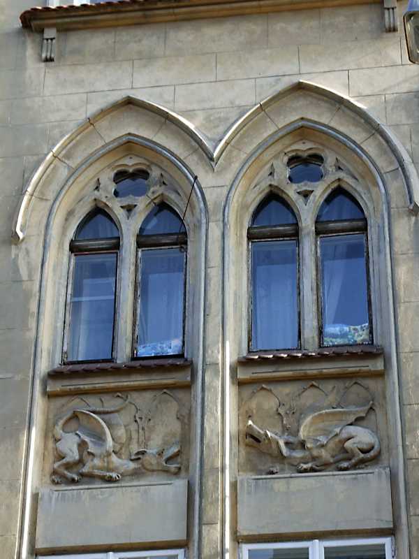 Стрілчасті вікна 3-го поверху з рельєфами Розмір зображення: 600:800 піксел 16 квітня 2013 р. Фото М.І.Жарких. Вкладені елементи Лівий рельєф дракона Правий рельєф дракона