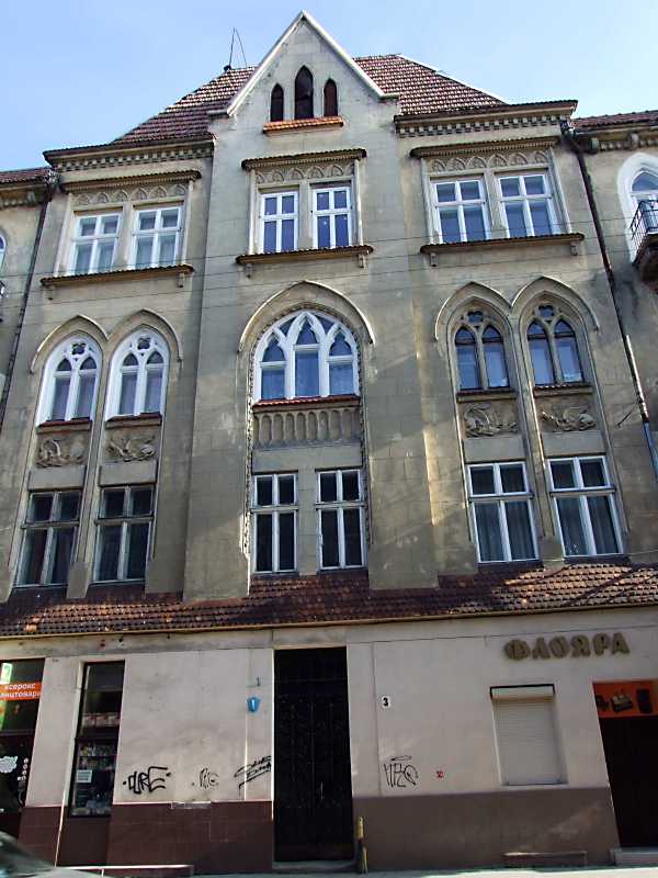 2013 р. Головний фасад Розмір зображення: 600:800 піксел 16 квітня 2013 р. Фото М.І.Жарких. Вкладені елементи Рельєф над вікнами 4-го поверху Стрілчасті вікна 3-го поверху з рельєфами (+)