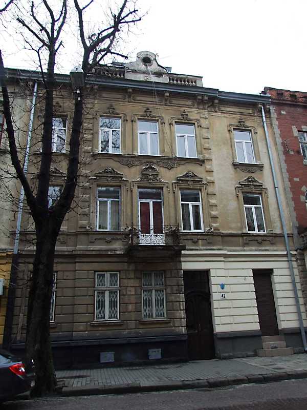 Житловий будинок (№ 42) Розмір зображення: 600:800 піксел 7 квітня 2012 р. Фото М.І.Жарких. Вкладені елементи 2012 р. Вікна 3-го поверху 2012 р. Вікна 2-го поверху Вітраж (+) 2013 р. Головний фасад (+)