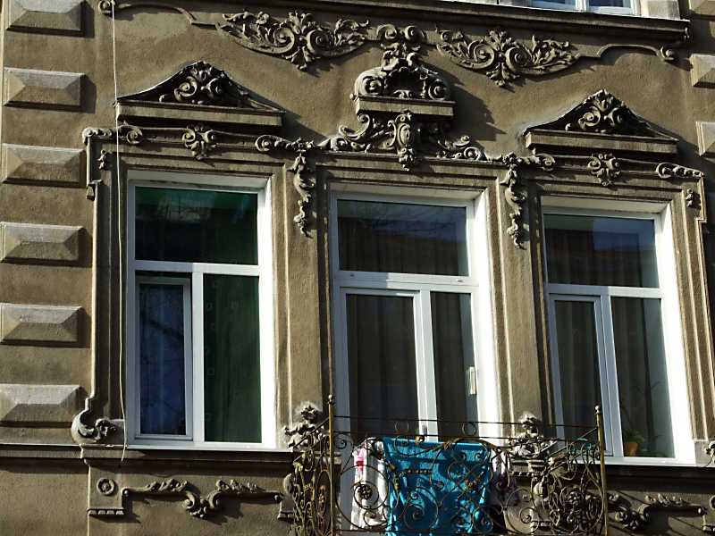 Вікна 2-го поверху Розмір зображення: 800:600 піксел 16 квітня 2013 р. Фото М.І.Жарких. Вкладені елементи Рельєфний фронтон над вікном