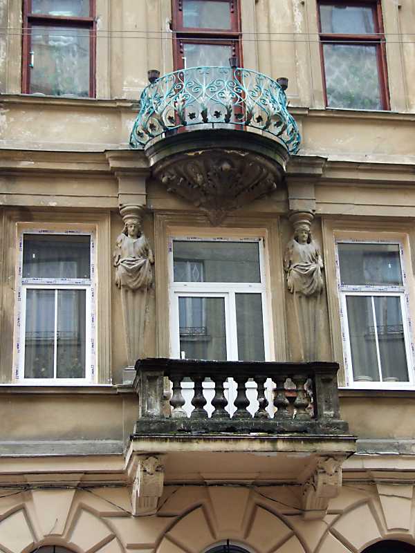 2012 р. Центральна частина головного фасаду Розмір зображення: 600:800 піксел 7 квітня 2012 р. Фото М.І.Жарких. Вкладені елементи Рельєфна консоль балкона Рельєфна пілястра