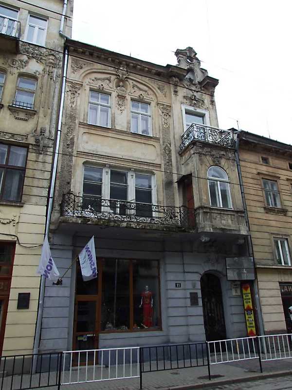 2012 р. Загальний вигляд Розмір зображення: 600:800 піксел 8 квітня 2012 р. Фото М.І.Жарких. Вкладені елементи Фронтон Сецесійні вікна 3-го поверху (+)