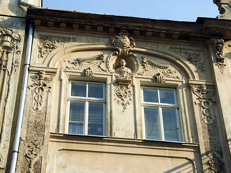 Сецесійні вікна 3-го поверху Розмір зображення: 800:600 піксел 19 квітня 2013 р. Фото М.І.Жарких. Вкладені елементи Ніша з бюстом Ф. Шопена Рельєфний жезл Меркурія