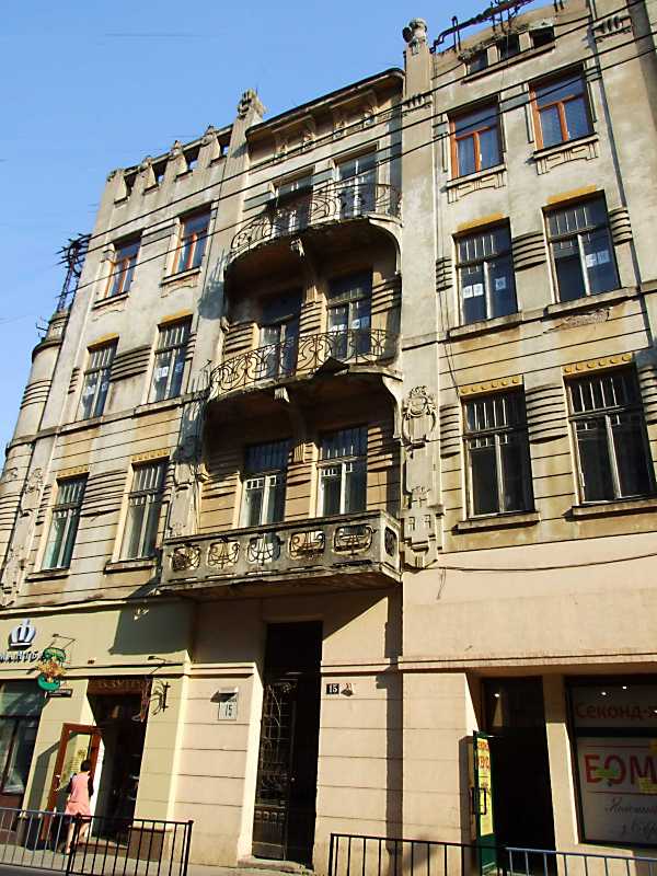 2013 р. Фасад по вул. Дорошенка Розмір зображення: 600:800 піксел 19 квітня 2013 р. Фото М.І.Жарких. Вкладені елементи Сецесійний антаблемент Сецесійна пілястра Сецесійні бильця балкону