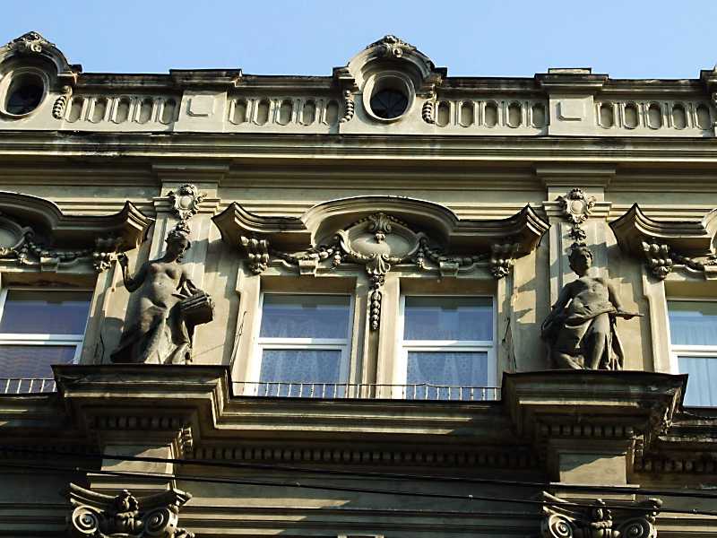 Фрагмент фасаду 3 Розмір зображення: 800:600 піксел 19 квітня 2013 р. Фото М.І.Жарких. Вкладені елементи Фігура 3 (наука) Міжвіконний картуш Фігура 4 (мистецтво)