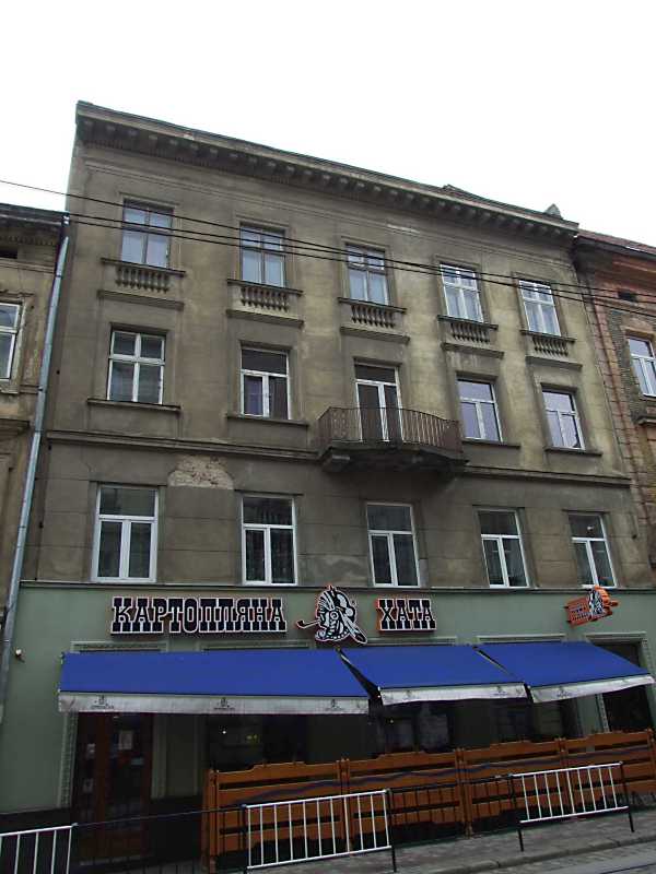 Житловий будинок (№ 27)Розмір зображення: 600:800 піксел 8 квітня 2012 р. Фото М.І.Жарких. У будинку № 27 у 50-60-х роках XX століття була сосисочна, нині “Картопляна хата”. Ілько Лемко Джерело: “”, 26 вересня 2008 року, № 141 (449) |