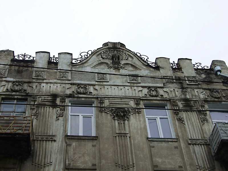 Сецесійний фронтон Розмір зображення: 800:600 піксел 8 квітня 2012 р. Фото М.І.Жарких. Вкладені елементи Рельєф павлина Мсакарон