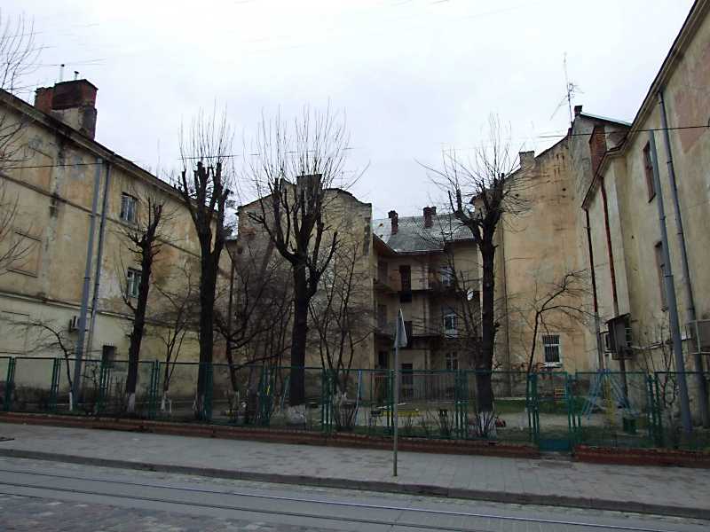 Ліворуч – брандмауер будинку по вул. П.Дорошенка № 48, праворуч – вул. брандмауер будинку по вул. П.Дорошенка № 44. В центрі – тиловий фасад будинку по вул. Крушельницької № 9.