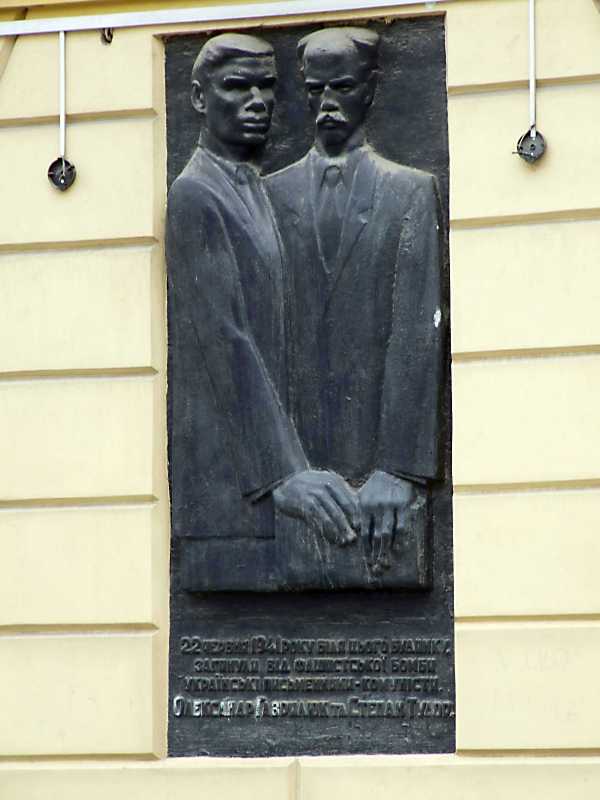 На дошці напис: «22 червня 1941 року біля цього будинку загинули від фашистської бомби українські письменники-комуністи Олександр Гаврилюк та Степан Тудор».