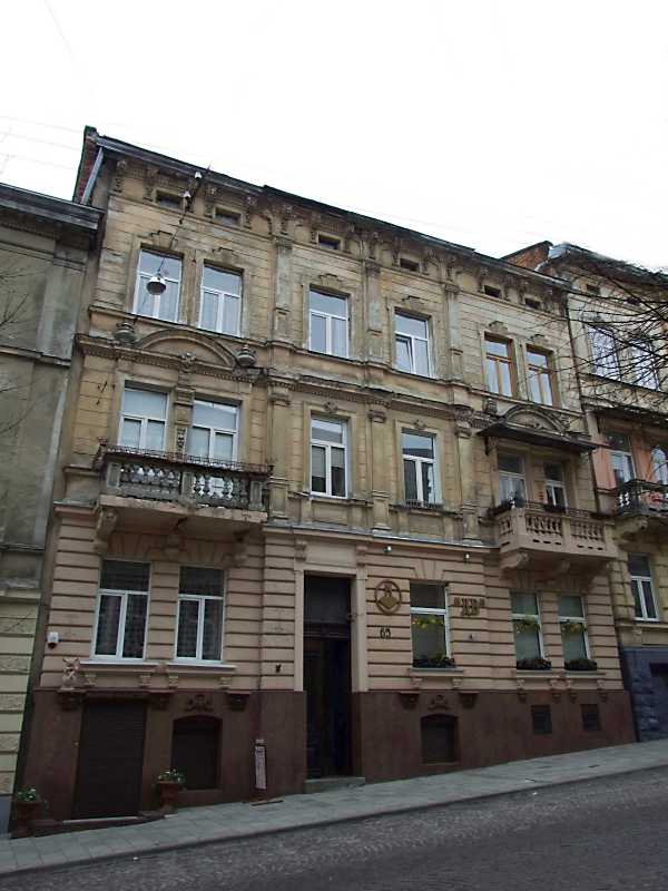 Житловий будинок (№ 65) Розмір зображення: 600:800 піксел 8 квітня 2012 р. Фото М.І.Жарких. Вкладені елементи 2012 р. Вікно 3-го поверху 2012 р. Вікно 2-го поверху 2012 р. Балкон 2-го поверху 2012 р. Загальний вигляд 2013 р. Головний фасад (+)