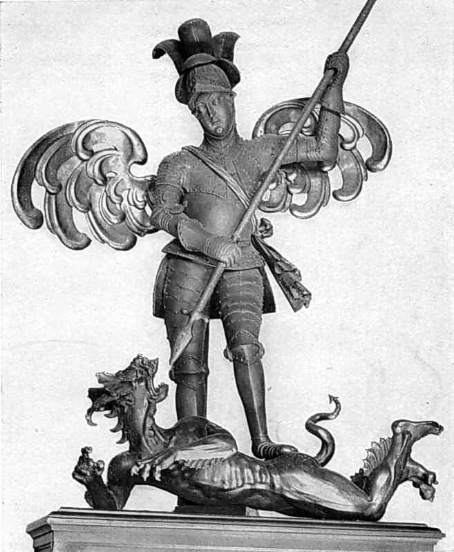Видатним твором металевої пластики є статуя архангела Михаїла з драконом, що була спочатку над головним входом так званого королівського арсеналу у Львові, збудованого у 1638 році. Автор її – згаданий вище Каспер Франковий. Скульптура зображує юнака в лицарському вбранні, що легким граціозним рухом вражає списом трохи наївно представленого дракона, який нагадує більш давні зображення чортів (дракона було виготовлено на сто років раніше). Всю композицію було вдало пов’язано з архітектурою порталу, увінчаного могутніми волютами. Зображення давнього покровителя міста мало своєю метою нібито підбадьорювати дух його оборонців (с. 152).