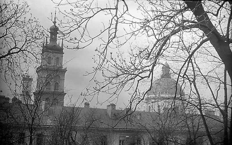 1976 р. Башта Корнякта і костел домініканців. Вигляд зі сходуРозмір зображення: 800:501 піксел 1976 р. 22 квітня. Фото М.І.Жарких. Негатека, № A109-09. |