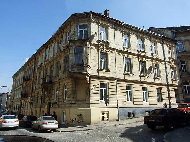 Житловий будинок (№ 5)Розмір зображення: 800:600 піксел Вул. Поповича повертає під прямим кутом довкола рогу цього будинку. 16 квітня 2013 р. Фото М.І.Жарких. |