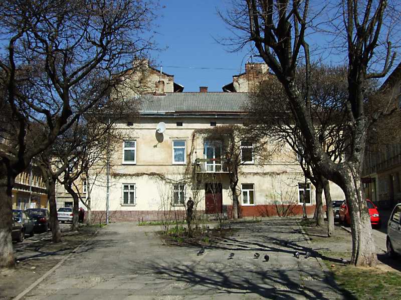 2013 р. Фасад з боку безіменної площіРозмір зображення: 800:600 піксел Ліворуч – вулиця Вітвера, праворуч – вулиця Різьбярська. 19 квітня 2013 р. Фото М.І.Жарких. |