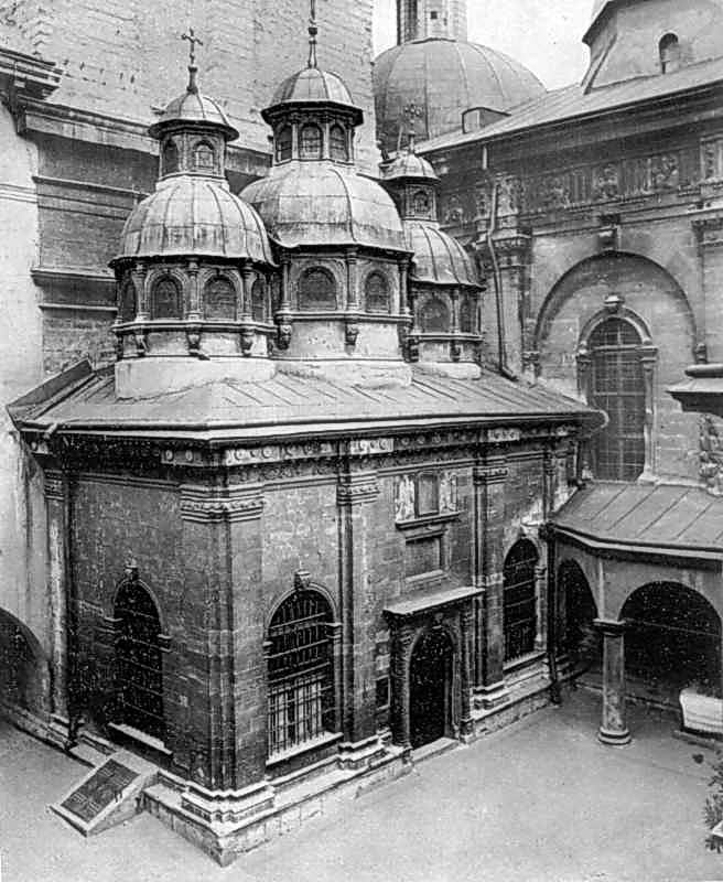 Каплиця 3 святителів. Загальний виглядРозмір зображення: 656:800 піксел Каплиця Трьох святителів у Львові. Загальний вигляд. 1590 – 1671 рр. Джерело: Історія українського мистецтва. – К.: Наукова думка, 1967 р., т. 2, с. 91. |