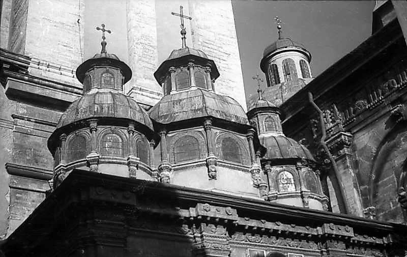 1977 р. Верхи каплиці. Вигляд з північного заходуРозмір зображення: 800:505 піксел 1977 р. 24 липня. Фото М.І.Жарких. Негатека, № A338-02. |