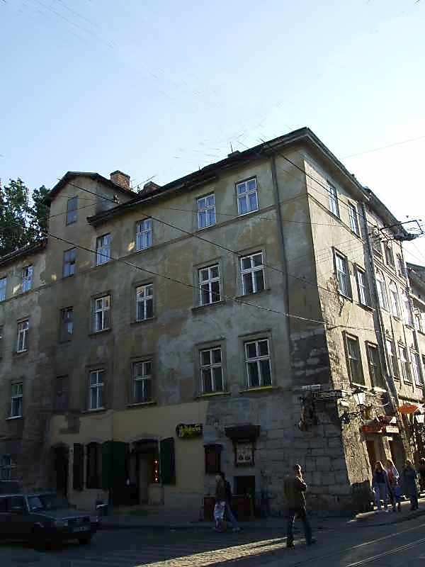 Будинок стояв уже в 16 ст. До нього зі сходу примикала брама, через яку входили до єврейського кварталу (нині тут пролягає вул.І.Федорова). В 1775 р. його перебудували архітектори Я.Петровський та М.Левандовський, він став двоповерховим з аттиком. Аттик знесено під час надбудови.