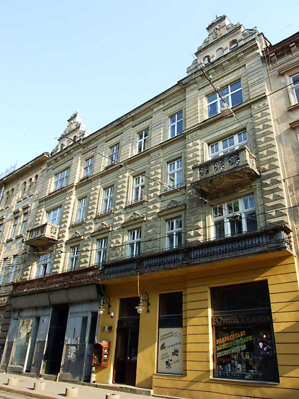 2013 р. Загальний вигляд Розмір зображення: 600:800 піксел 19 квітня 2013 р. Фото М.І.Жарких. Вкладені елементи Фронтон (1) Фронтон (2) Балкон 3-го поверху Вікно 2-го поверху