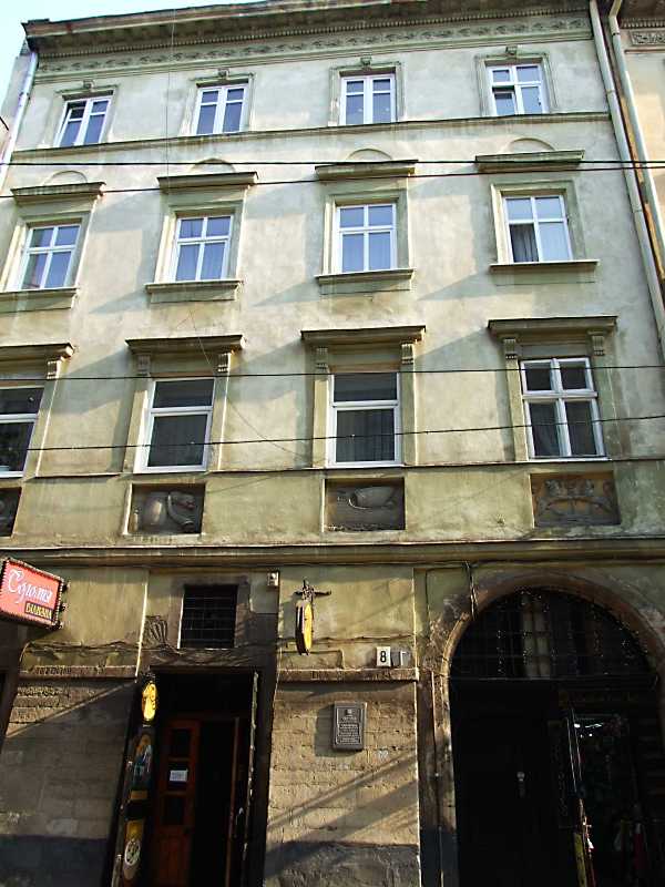 ЖИЛОЙ ДОМ, XVII в. (ул. Русская, 8). Перестроен в 1740 г. Кирпичный, четырехэтажный, выходит на улицу узким фасадом. Фасад украшен рельефами с изображениями львов, дельфинов и кораблей. [Памятники градостроительства и архитектуры УССР. – К.: Будівельник, 1985 г., т. 3, с. 41].