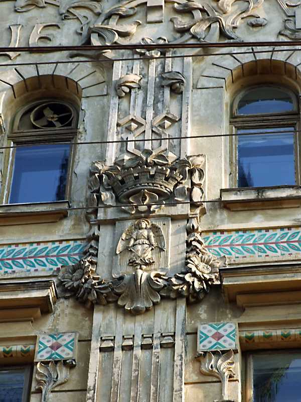 Сецесійна пілястра з рельєфом архангела МихаїлаРозмір зображення: 600:800 піксел 19 квітня 2013 р. Фото М.І.Жарких. |