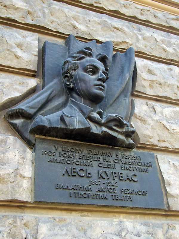 На дошці напис: «У цьому будинку в вересні 1909 року вперше на студентській аматорській сцені виступав Лесь Курбас (1887 – 1942), видатний актор, режисер і теоретик театра».