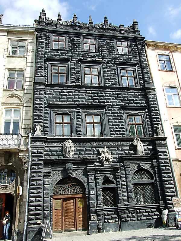 Чорна кам’яниця кін. 16 ст., архіт.П.Красовський. Капітальний ремонт 1675 – 1677 рр., зроблено скульптури на фасаді, відновлено аттік і портали 1 і 2 поверхів; архіт. М.Градовський. В 1884 р. надбудовано 4-й поверх. [Нариси історії архітектури України: дожовтневий період. – К.: Держбудвидав, 1957 р., список пам’яток].